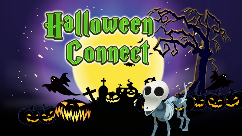 Mahjong Connect game for Halloween. Connect two of the same Halloween images with a path that has no more than two corners of 90 degrees.